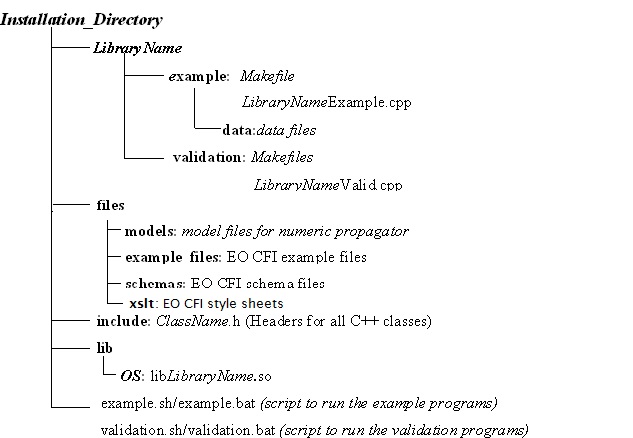 Upon completion the installation procedure, the following directory structure will be created: (OS: LINUX32_LEGACY, LINUX64_LEGACY, LINUX64, MACIN64, WINDOWS) (LibraryName: FileHandling, DataHandling, Lib, Orbit, Pointing, Visibility)